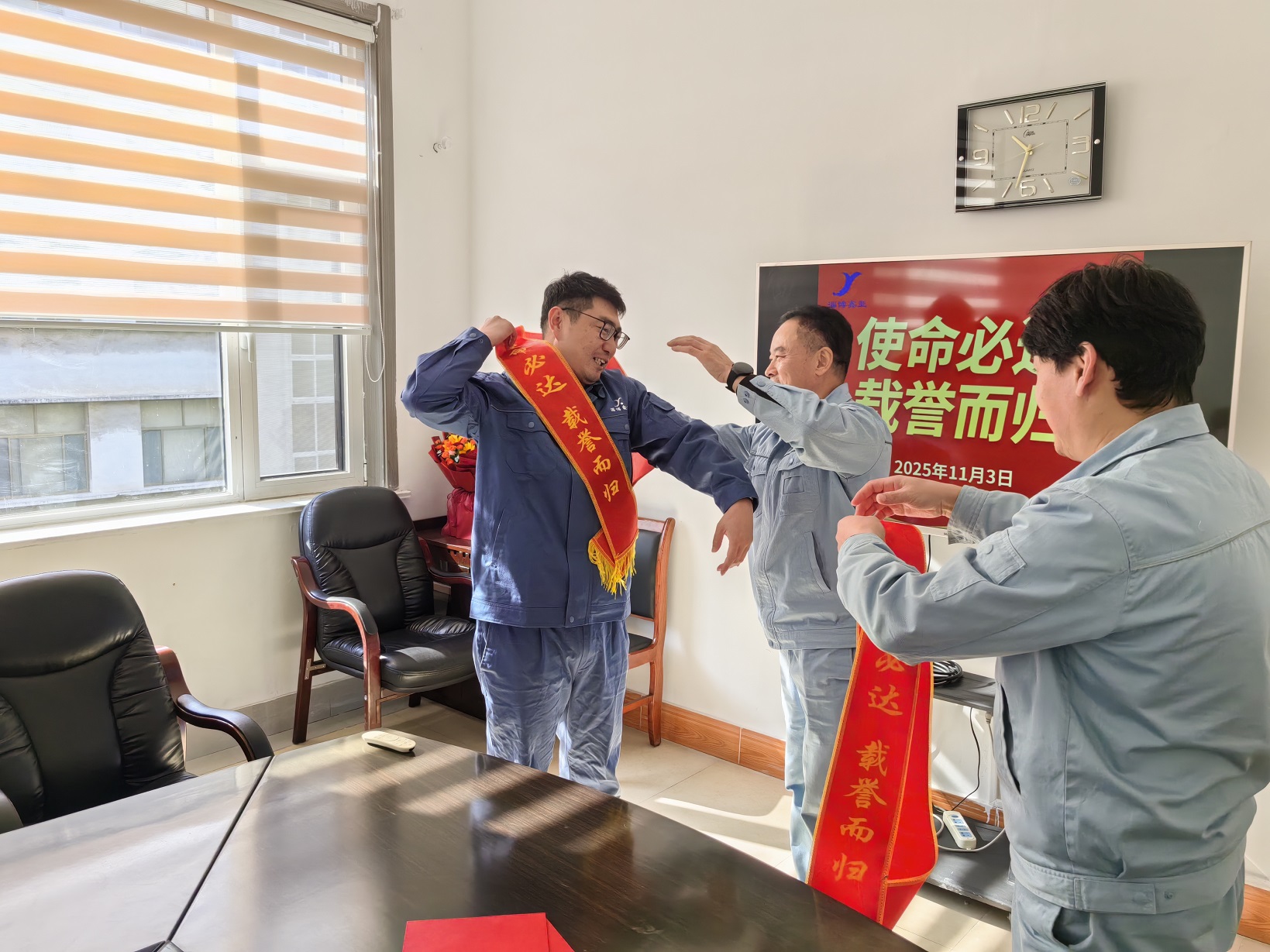 为关爱长期驻外员工、保障队伍可持续作战,公司建立轮岗机制,让奋斗者安心、家人放心。2025年11月3日,首批返岗人员载誉归来,公司举行简朴而热烈的欢迎仪式,向他们致以诚挚敬意和表彰奖励。